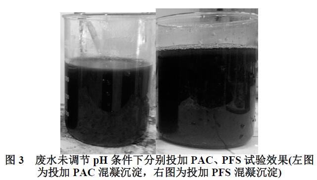 廢水不投加pH調節(jié)劑,維持原水pH為5.5時,分別單獨投加200mg/L的PAC、PFS及3mg/L的PAM進行混凝沉淀試驗,試驗采取平行對比三次均值法。試驗結果顯示,不調節(jié)pH維持原水pH為5.5條件下,分別投加PAC、PFS,兩者均無明顯表觀反應,無沉淀物產生,水樣渾濁(見圖3),經取樣分析測定,兩者對廢水中的污染物CODCr、LAS、色度均無明顯去除作用效果。